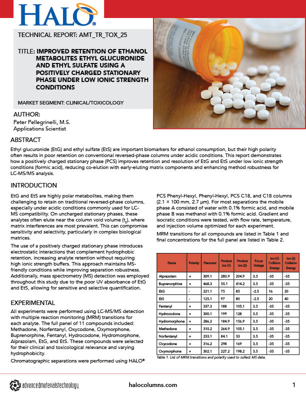 Improved Retention of Ethanol Metabolites Ethyl Glucuronide and Ethyl Sulfate Using a Positively Charged Stationary Phase Under Low Ionic Strength Conditions